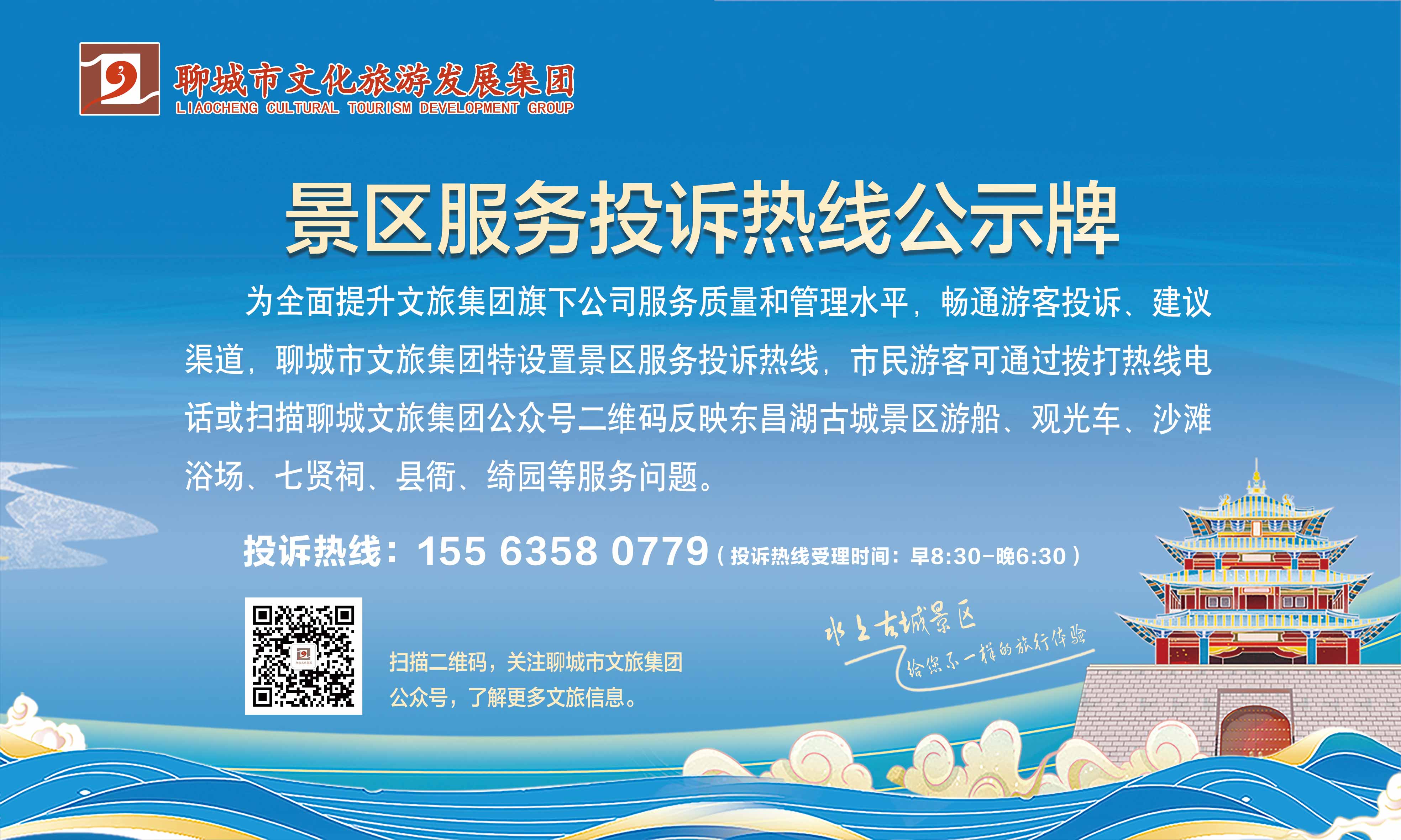 為全面提升文旅集團(tuán)旗下公司服務(wù)質(zhì)量和管理水平,暢通游客投訴、建議渠道,聊城市文旅集團(tuán)特設(shè)置景區(qū)服務(wù)投訴熱線,市民游客可通過撥打熱線電話或掃描聊城文旅集團(tuán)公眾號(hào)二維碼反映東昌湖古城景區(qū)游船、觀光車、沙灘浴場(chǎng)、七賢祠、縣衙、綺園等服務(wù)問題。