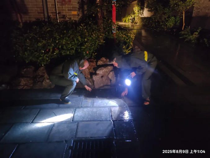 8月9日凌晨3時許強降雨來襲,雨情就是號令,工作人員立即赴一線,疏通排水、清理障礙,30分鐘內(nèi)完成了易積水路段的應急響應全流程閉環(huán)處置。